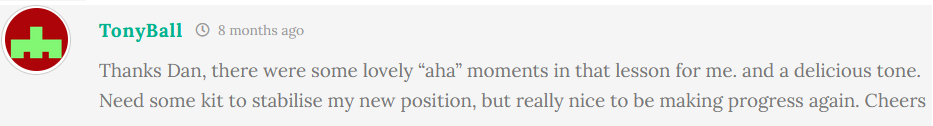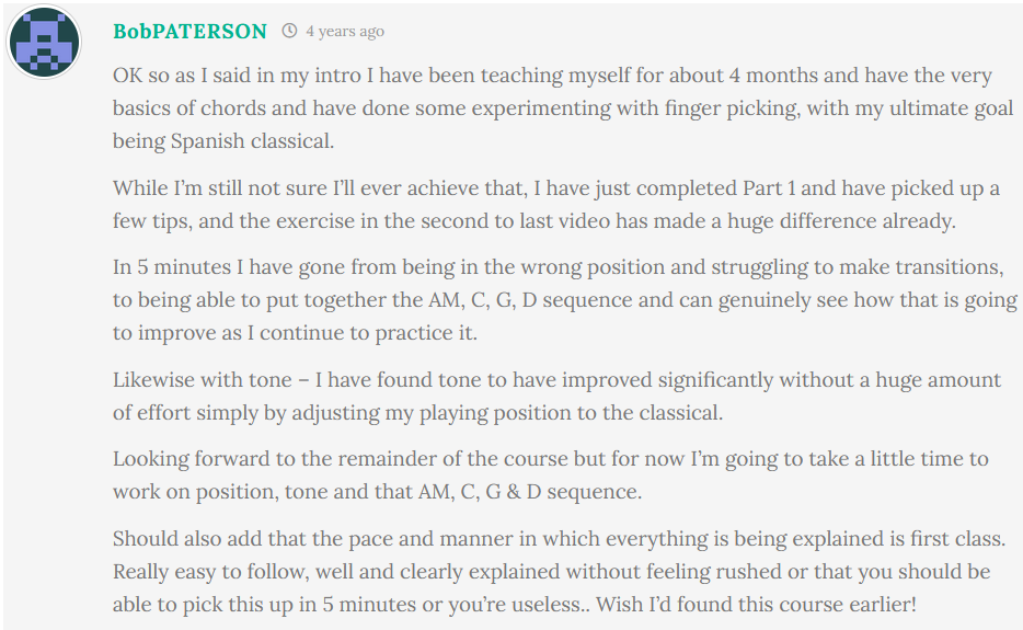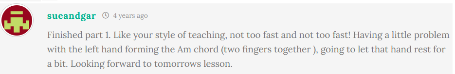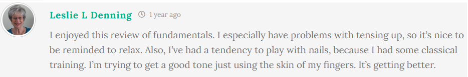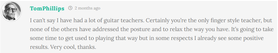 Many Fingerstyle 101 students started later in life or felt stuck for years. Here are a few of their stories and thoughts over the past few years. You’ll see all these comments around the course as you go through it. (Do leave your comments on each page too – those who do tend to succeed faster!).